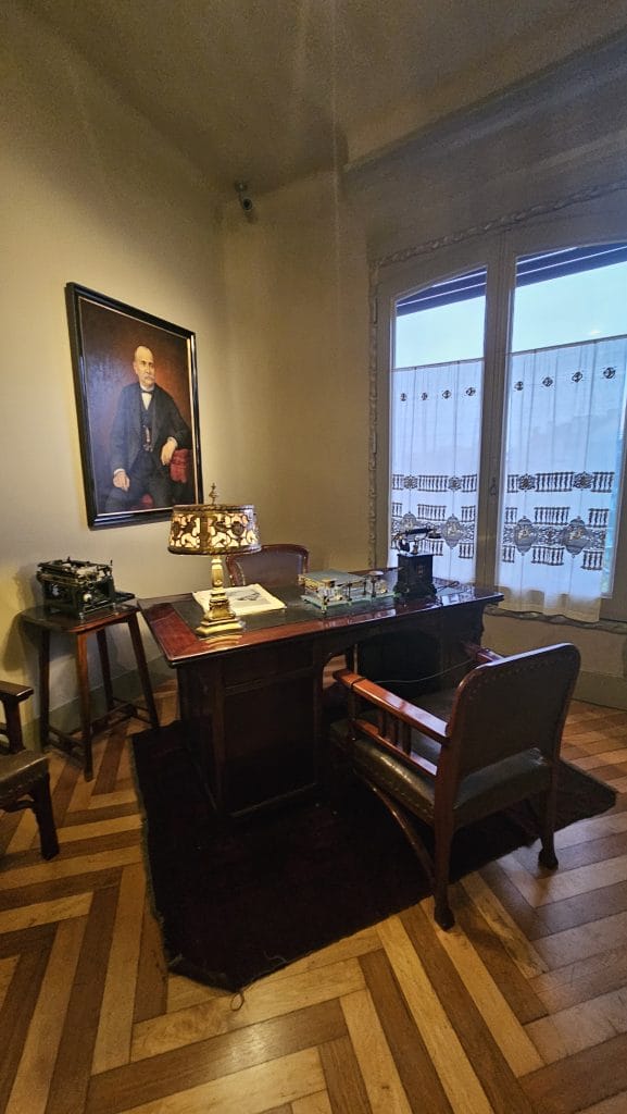 A private study inside La Pedrera – showcasing strong floor and window design elements, and personal family art & artifacts that add soul to the decor.